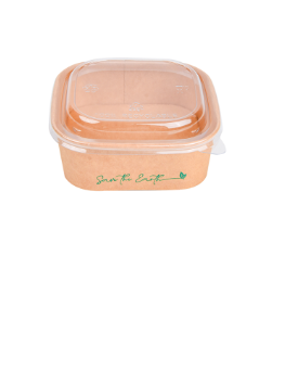 Envase alimentario de cartón, cuya capa interna está plastificada. La tapa es de plástico PET. Ideales para contener comida rápida, take away, etc.