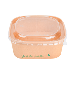 Envase alimentario de cartón, cuya capa interna está plastificada. La tapa es de plástico PET. Ideales para contener comida rápida, take away, etc.